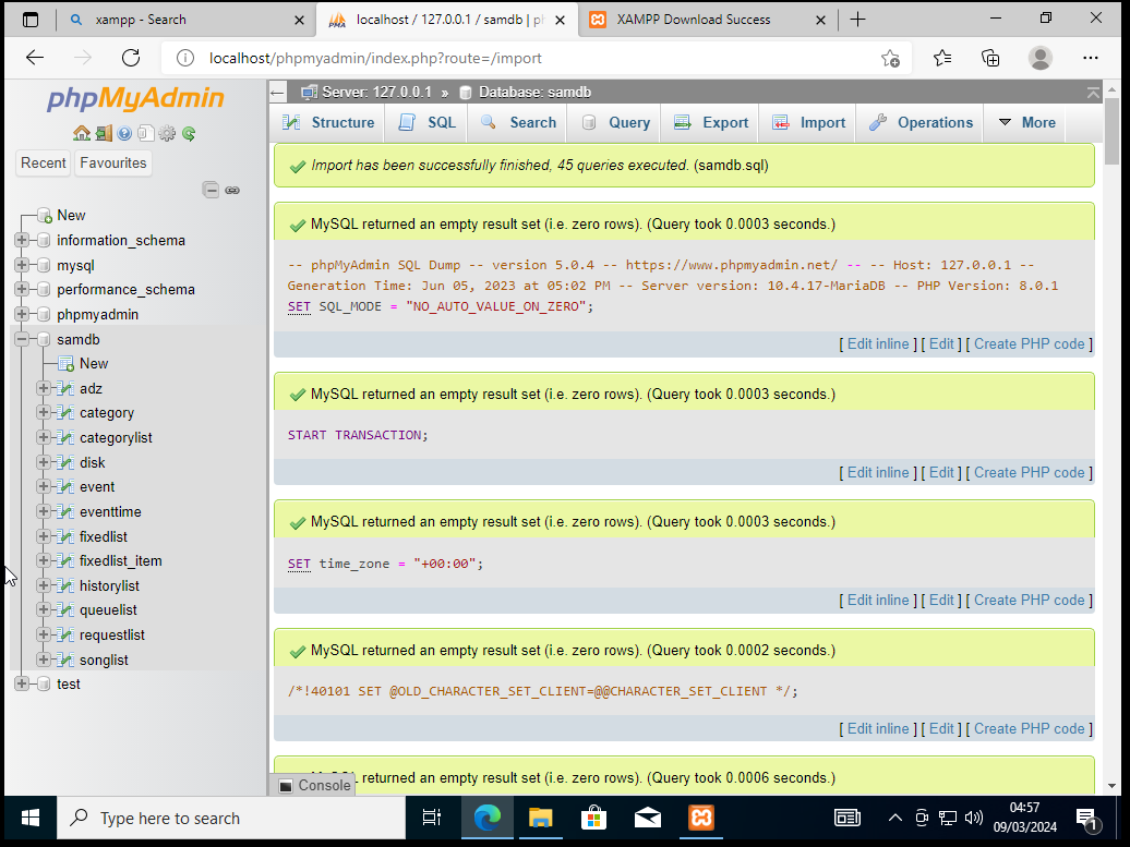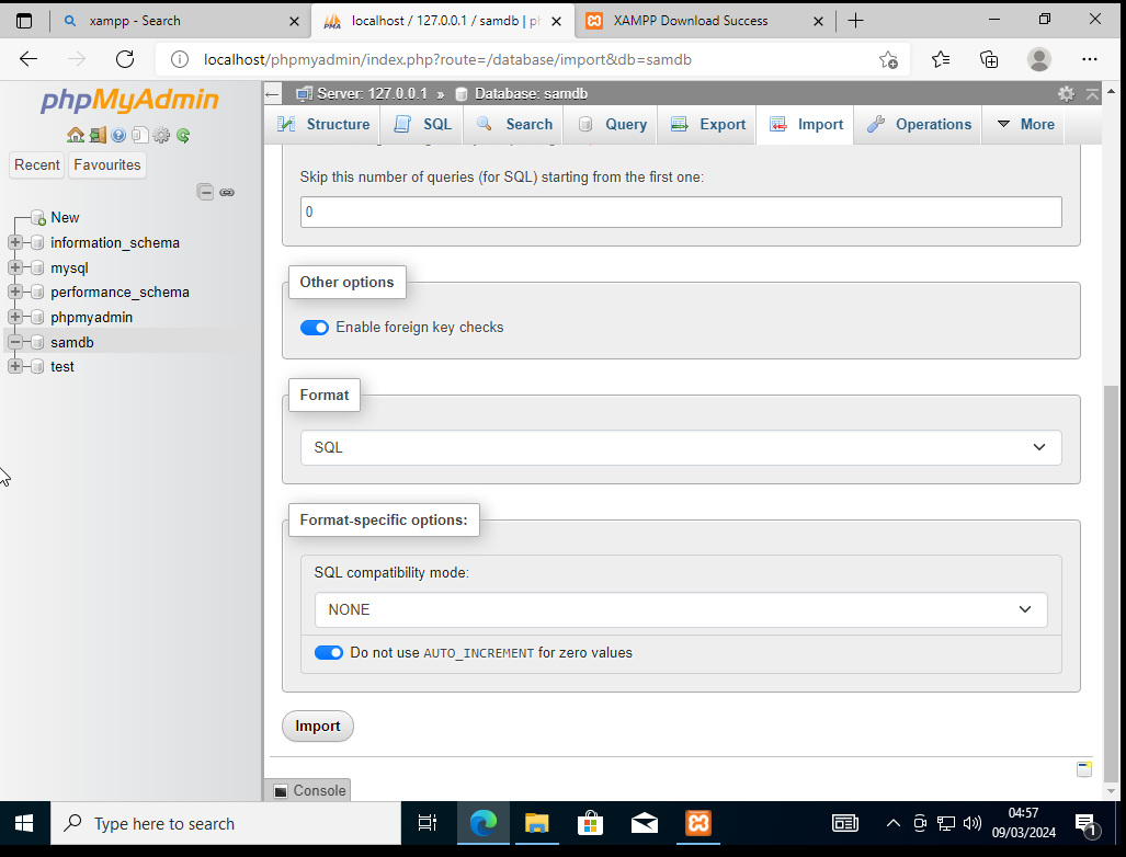 -> Look it says samdb (lower case) & direct you to Tables page click on import